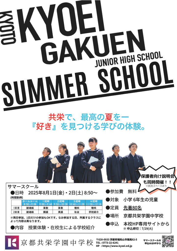 サマースクールは小学6年生を対象とし、共栄中の授業を受けてもらったり先ぱいたちから学校の雰囲気を伝えてもらうようなイベントです。