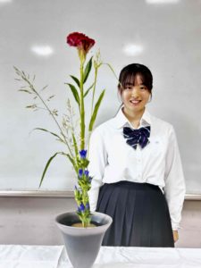 茶道・華道部 Home > 高等学校クラブ > 茶道・華道部 > 第3回 華道実習 2025年9月2日 第3回 華道実習 9月1日(月)に第3回華道実習を行いました。講師の余田先生にご指導いただき、前回同様”生花(しょうか)”に挑戦です。 今回はケイトウ、リンドウ、セイバンモロコシの3種類を使った3本立てです。 さわやかな感じに仕上がりました! セイバンモロコシではなく、ミズキにすると、こんな感じに(左側)。また印象が変わって面白いですね。 関連記事: 第2回 華道実習 第1回 華道実習 今日のお稽古 福知山市文化祭 中丹 OCHA EXPO ② 人気記事: 卒業式 卒業式 文化祭に向けて① 文化祭 卒業 【中学】入試イベント 【高校】入試イベント 修学支援金制度 アクセス 在校生専用