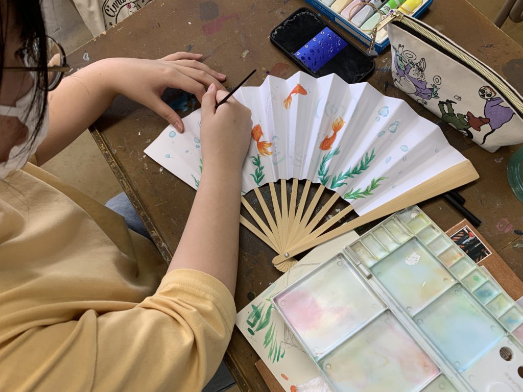 美術の授業では扇子の絵付けが行われています。涼しげな絵柄です。