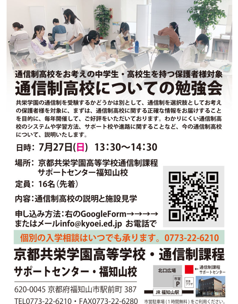 今年は保護者対象の「通信制についての学習会」の2回目を7月27日(日)に実施します。この説明会は、何かと解らないことが多い通信制高校について、そのシステムや特徴、メリットデメリットなどを含めて、正しい知識を持ってもらうことを目的として、毎年開催してご好評をいただいております。共栄学園の通信制を受験するかどうかは別にして、通信制を進路選択肢としてお考えの、中学生、高校生の保護者様を対象としておりますので、お気軽にご参加ください。(住所や連絡先など、個人情報はいただきません。)
