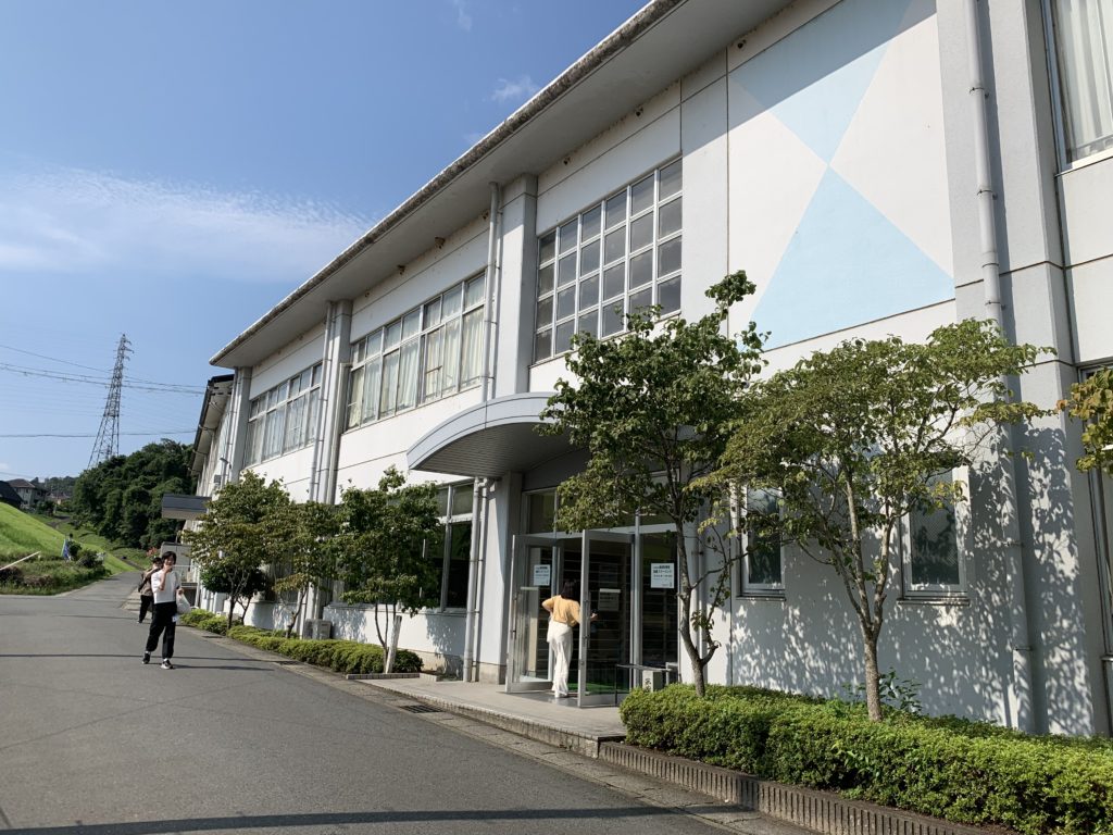 スクーリング会場の4号館、まずはここから2階へ上がって、出席を記入してもらいます。